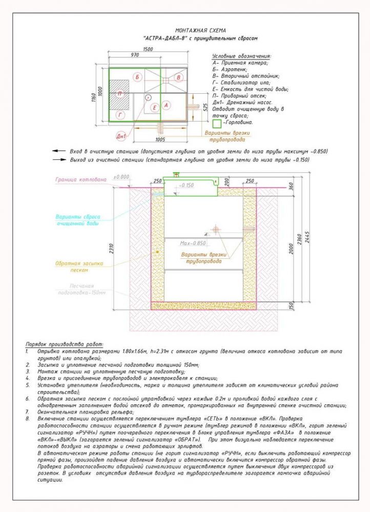Принцип работы септика основан на применении механического и биологического способа работы, которые исключают попадание в окружающую среду вредных химических веществ. Многоступенчатая очистка обеспечивает получение технической жидкости экологически безопасной и пригодной для использования в поливе и хозяйственных нуждах. Индекс «ПР» в названии обозначает наличие принудительного способа отвода очищенной жидкости.